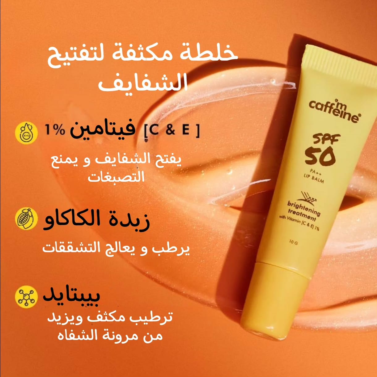 ✔️ غني بفيتامين( C و E بنسبة 1%) ، فهو يعمل على توحيد لون الشفاه 👄 ويمنع التصبغ. توفر زبدة الكاكاو 🍫 ترطيبا على مدار 24 ساعة ⏳ ، وشفاء الشفاه الجافة والخشنة ، بينما الببتيدات تساعد في زيادة المرونة و منع الخطوط لإمتلاء جميل 💋.